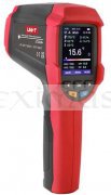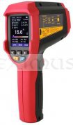 Profesionální bezkontaktní infračervený teploměr UT-305A+ dokáže rychle a přesně určit povrchovou teplotu v rozmezí -50°C až +1850°C změřením infračervené energie vyzařované z cílového povrchu. Pro snazší a intuitivní zaměření přístroje na cílový povrch je zabudován laser, který indikuje správné zamíření teploměru. Poměr vzdálenosti k průměru měřeného povrchu je u tohoto přístroje 55 :1. Tento teploměr má zabudované další funkce, např. měření teploty okolí teploměru, měření teploty kontaktním termočlánkem typu K, měření relativní vlhkosti okolí teploměru. Na základě těchto změřených hodnot sám vypočte teplotu rosného bodu nebo teplotu vlhkého teploměru. Do teploměru je možné zadat systémový čas a datum. Měření hodnot je možné naplánovat v předem stanovených intervalech a celkem 999 událostí (skupin dat) uložit do interní paměti. Je možné přednastavit emisivitu měřeného povrchu v rozmezí 0,1 až 1,0. Indikaci přednastavených funkcí a naměřených hodnot zajišťuje jasný a vysoce kontrastní TFT LCD barevný displej a hraniční hodnoty jsou indikovány bzučákem a na displeji. Je možná indikace minimálních, maximálních a průměrných teplot a odchylek od průměru ( MIN, MAX, AVG, DIF ). Přístroj je odolný proti pádu z výšky 1 metru.