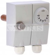 Kombinovaný jednopólový krytovaný termostat s teplotní pojistkou jak pro nastavení teploty tak i pro ruční přepnutí bezpečné teploty využívající roztažnosti tekutiny, doplněný průchodkou kabelů a přepínacím kontaktem.