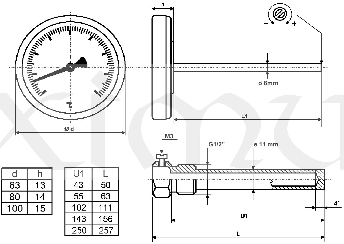 Teploměr bimetalový přímý, zadní stonek, včetně ocelové jímky se závitem G1/2", L=60mm