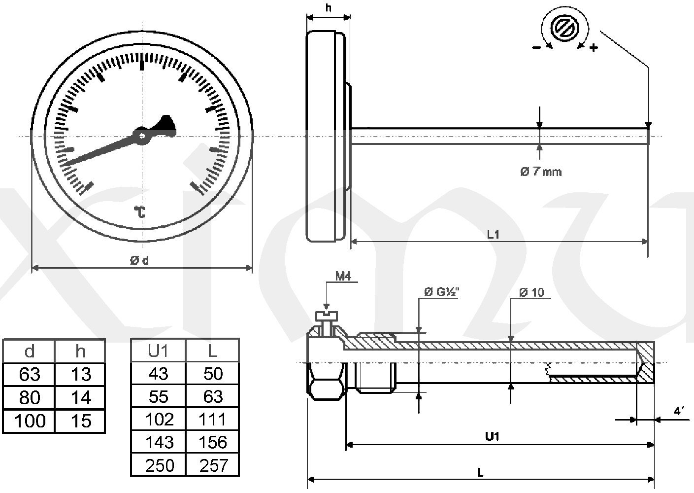 V hlavici je upevněn ukazatel s číselníkem a stonek, v němž je upevněn měřicí systém. Tento systém je zhotoven z bimetalu ve tvaru válcové spirály, která se působením tepla otáčí kolem své osy. Pohyb je přenášen na ukazatel, který vykazuje určitou výchylku udávající teplotu na stupnici. Aby údaje teploměru byly správné, je nutno při zabudování zajistit, že celý měřicí systém bude ponořen v měřené teplotě.