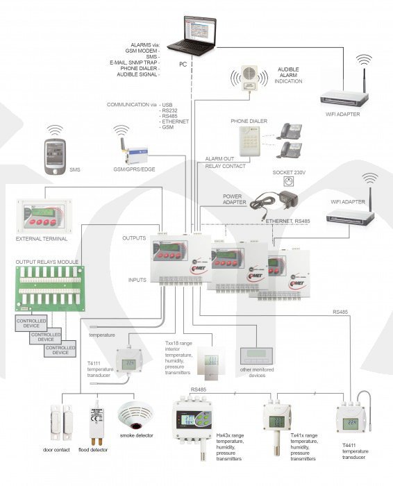 Monitorovací systém s měřicí ústřednou. Kompletně vybavená ústředna, dvouřádkový alfanumerický LCDdisplej, čtyři ovládací tlačítka, 32 alarmových LED svítivek. Šestnáctivstupý monitorovací systém je určen pro sběr dat ze snímačů nejrůznějších veličin, signalizaci alarmových stavů, případně pro řízení dalších procesů. Měřicí ústřednou lze měřit a zaznamenávat analogové veličiny, frekvenci, počítat impulsy, vyhodnocovat dvoustavové veličiny a načítat údaje ze zařízení pracujících s protokolem ModBus RTU nebo Advantech. Údaje lze kdykoli přenést do osobního počítače přes rozhraní USB, RS232, Ethernet nebo GSM modem pro další zpracování. 53 možností vstupních modulů a veličin. Dodáváno včetně kalibračního listu.