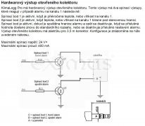 Výstup na konektor jack3.5, spínání otevřeným kolektorem do 24V/400mAdc, maximální a minimálního alarmu na kanálu jedna teploty nebo vlhkosti.