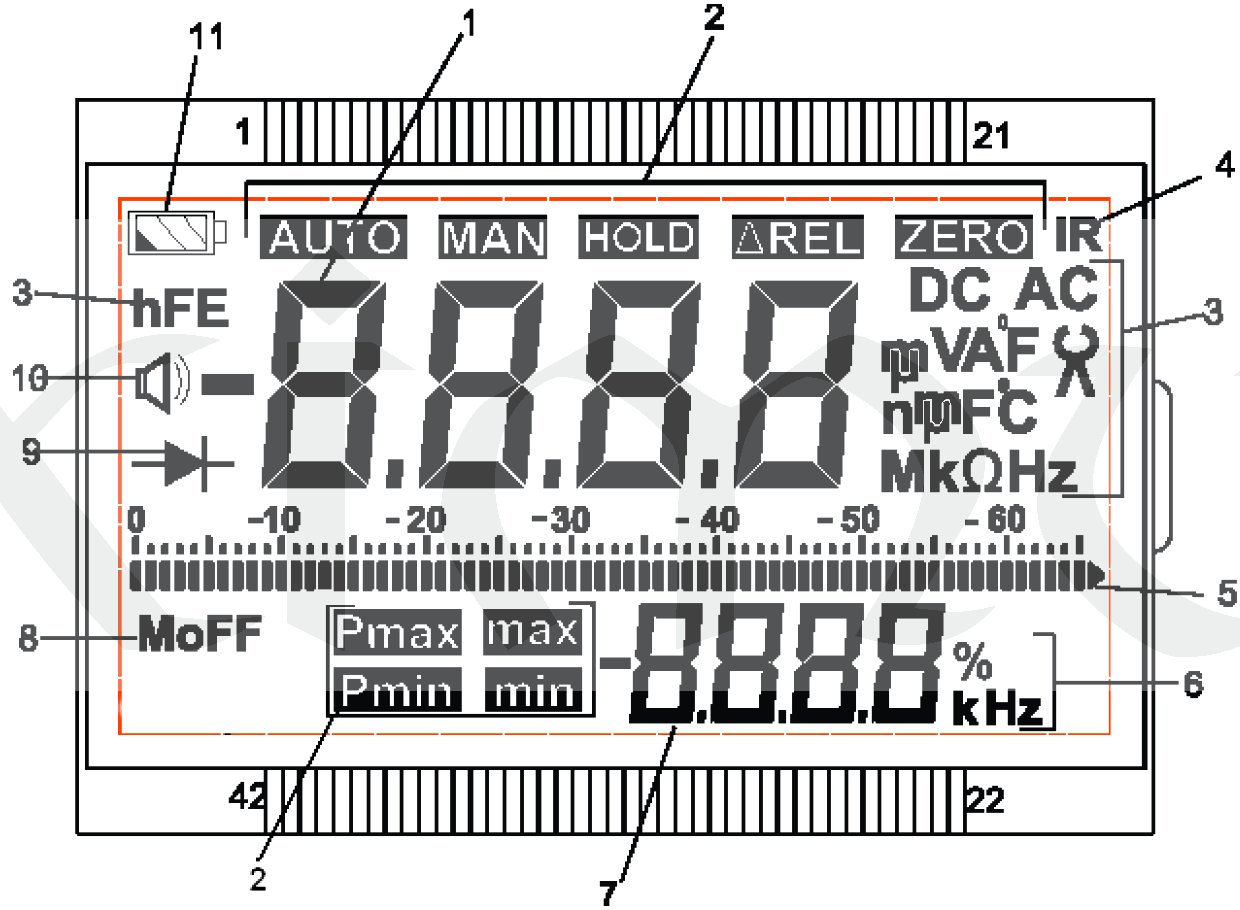 Multimetr s dvouřádkovým přehledným displejem a bargrafem, podsvětlený LED.