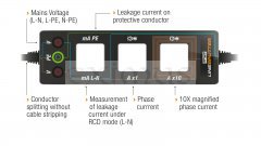 LINESPLITTER je velmi užitečný nástroj, který umožňuje jednoduše měřit protékající střídavý proud na zařízeních připojených do jednofázové zásuvky. LINESPLITTER je připojen vidlicí a zásuvkou mezi zásuvkou a zkoušeným přístrojem. LINESPLITTER rozděluje (fázový a nulový) a ochranný (PE) vodič, což umožňuje přímé měření unikajícího proudu v PE vodiči a nepřímé na L + N. LINESPLITTER má navíc dvě měřící smyčky pro měření (1x) a (10x desetinásobek) proudu fázového vodiče. LINESPLITTER nabízí 3 banánkové zdířky pro připojení standardních banánkových zástrček pro rychlé a bezpečné měření napětí (L-N, L-PE, N-PE).