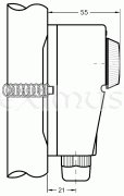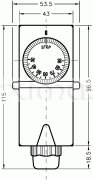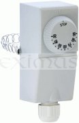 Jednopólový zakrytovaný termostat pro ovládání teploty využívající roztažnosti tekutiny, vybavený průchodkou kabelů a přepínacím kontaktem.