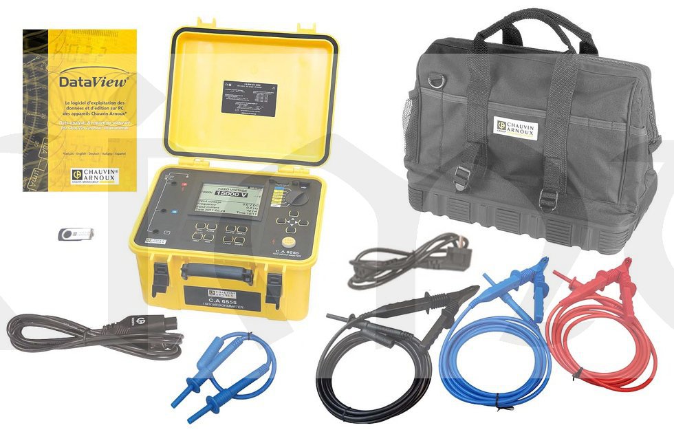 Měřič izolace C.A 6555, 3ks měřicí vodiče 3m, ochranný vodič 0,5m, software DataView, USB kabel, přenosná brašna, napájecí vodič a návod k obsluze v českém jazyce.
