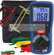 Digitální měřič se snadnou obsluhou vhodný pro zjištění uzemňovacího odporu v domovních instalacích apod. Je možno volit mezi 2-pólovým a 3-pólovým měřením. Díky malým rozměrům, bateriovému provozu, stříkané gumové ochraně a jednoduchému intuitivnímu ovládání je tento přístroj ideální pro mobilní použití.