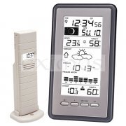 Tato 868 MHz teplotní stanice zobrazuje rádiem řízený čas, datum, kalendář, fáze měsíce, vnitřní a venkovní teplotu, vnitřní a venkovní relativní vlhkost, tlak vzduchu, MIN/MAX záznamy teplot a zobrazuje také předpověď počasí.