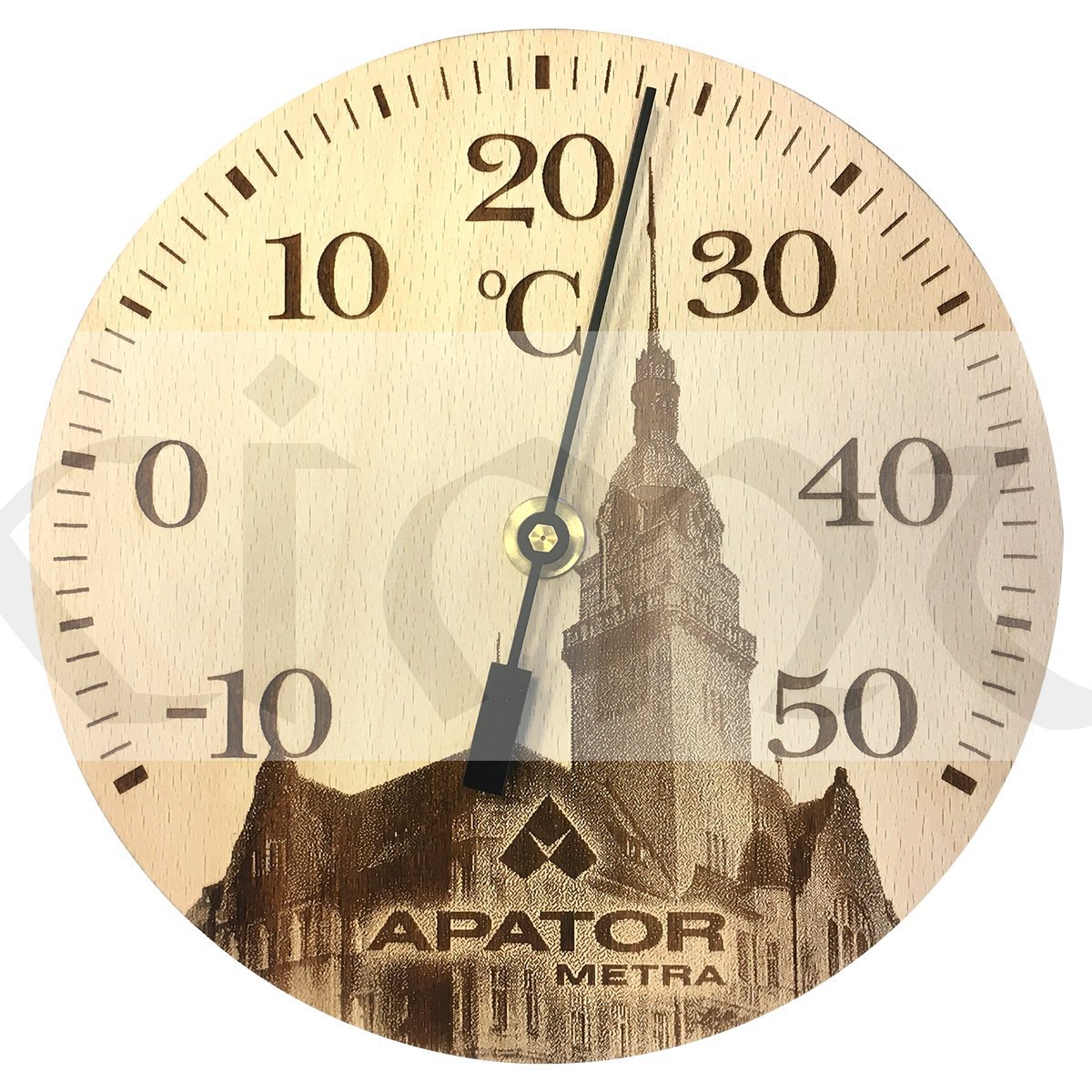 Nástěnný teploměr dřevěný kompozit s potiskem je určený pro měření teploty v interiéru.