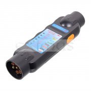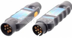 Praktický tester 7 pólových zásuvek i vidlic přívěsných vozíků, karavanů i tažných vozidel. Napájení 12V.