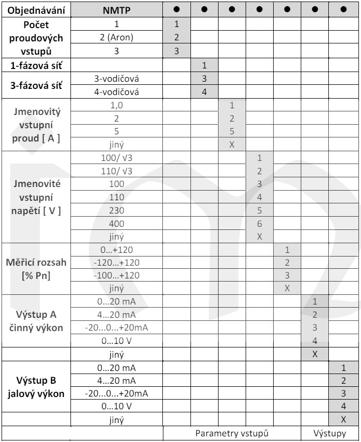 Výběr parametrů dle tabulky objednacích kódů.